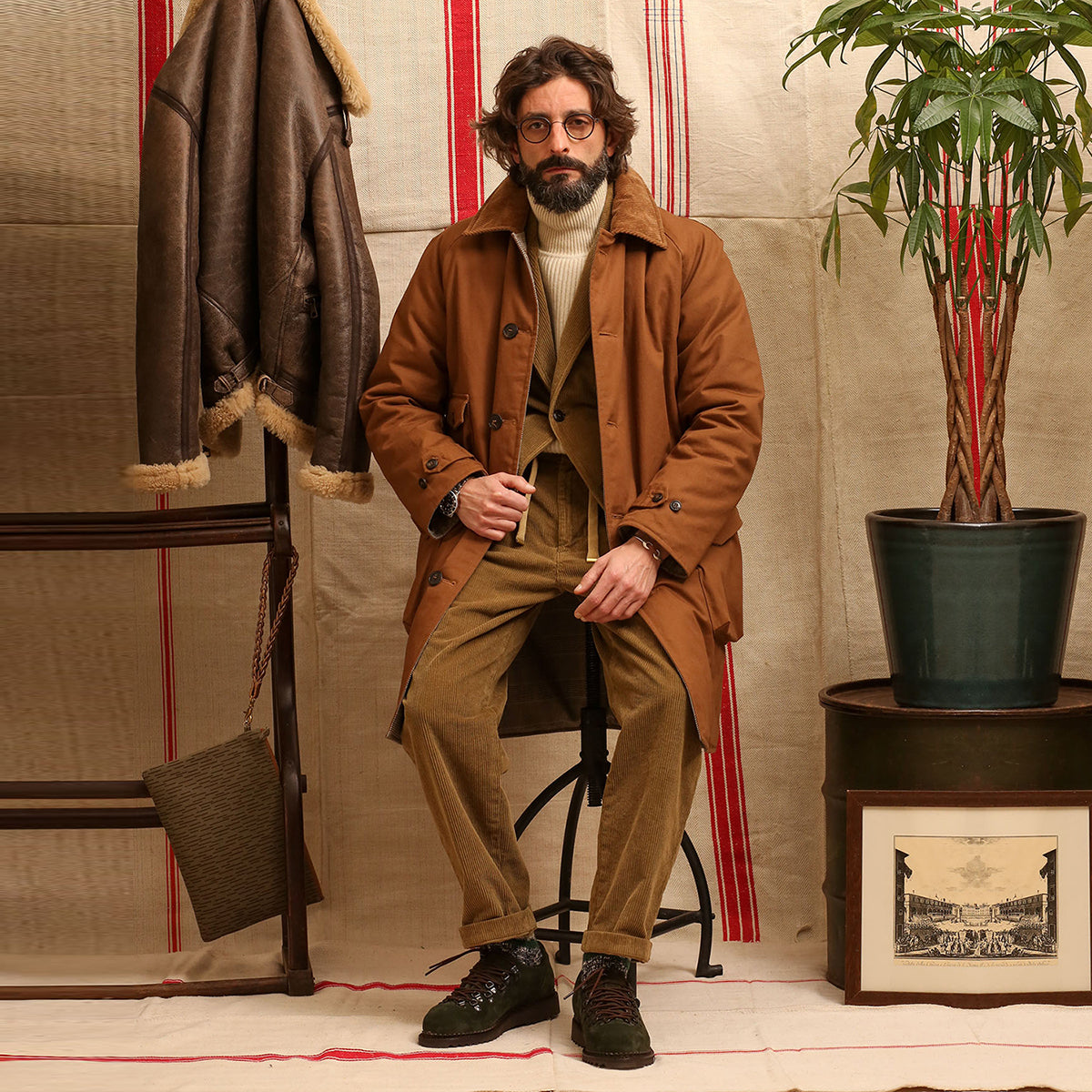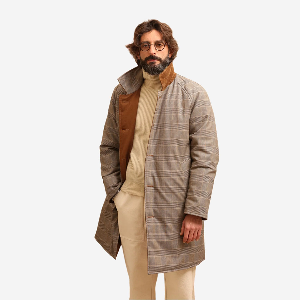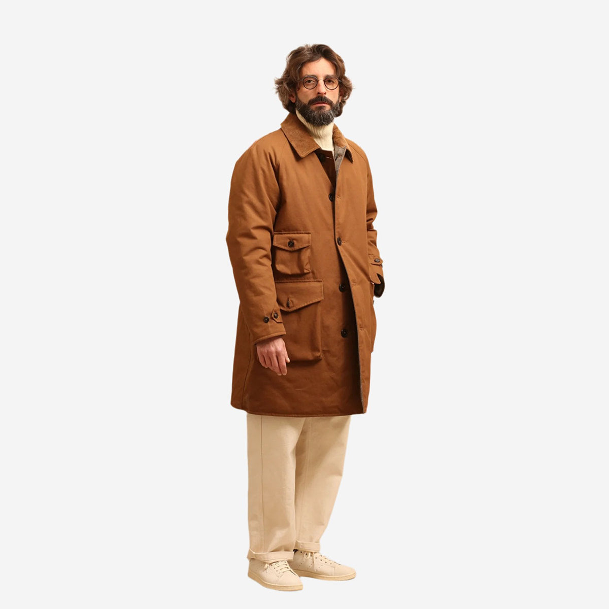 This Bearing reversible trench coat from East Harbor Surplus exudes classic workwear sensibility and offers comfort, free range of motion and protection against the wind, water and moisture. One side is made of brown cotton canvas and features three buttoned patch bellowed pockets. The other side is made of wool fabric with a dense houndstooth check pattern in various sizes and features two angled hand pockets. The collar is lined with durable, skin-friendly corduroy fabric to create a classic workwear vibe. The corozo nut buttons are larger than standard buttons, giving the piece a classic, stylish look while the padded insulation provides ideal warmth without the bulk.
