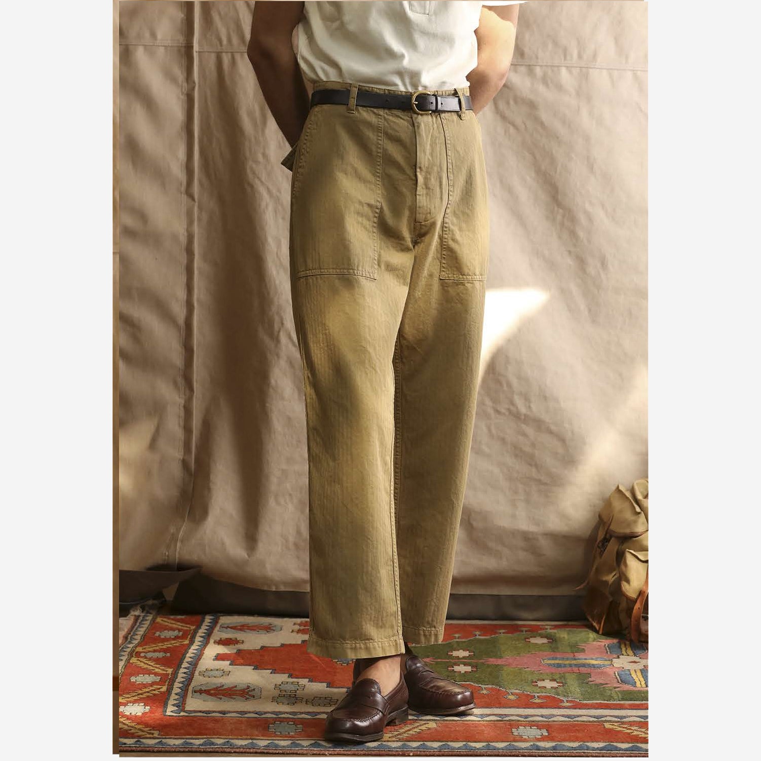 This traditionally styled yet sartorial fatigue pant from East Harbour Surplus draws influence from the iconic OG-107 military trouser, and has been crafted from a washed herringbone twill (HBT). With simple patch pockets on the front and button flap pockets on the back for security, the ‘Texas’ trouser is cut in a regular straight shape, for the perfect vintage silhouette. Durable flat felled seams have been added throughout this model, to ensure that these trousers will stand the test of time, and the shape can be easily adjusted with buttoned waist epaulettes. A full set of real corozo buttons have been used on this design, as an added touch of quality assurance.