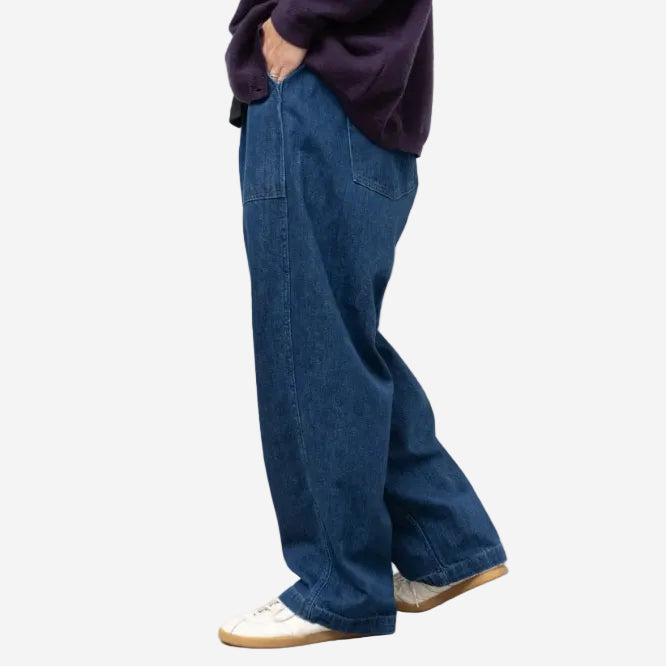Ordinary Fits presents the James Fatigue in a denim, a slightly modified version of their classic James Pants. The material uses nep yarn made from revival (waste) cotton for the warp which results in a soft hand feel with a loose weave. The waist feature an elastic back and the front is flat and clean so that it looks neat when tucked in. There are buttons on the sides to allow for fine adjustment of the waist. The relaxed, rounded design with a unique volume creates a balanced and comfortable silhouette that is typical of Ordinary Fits.