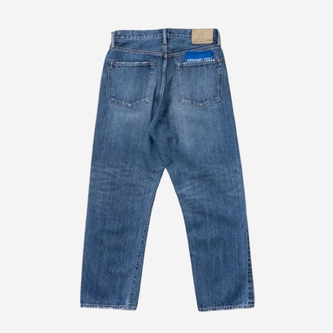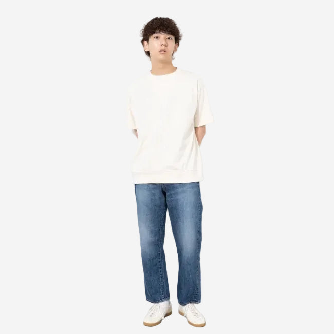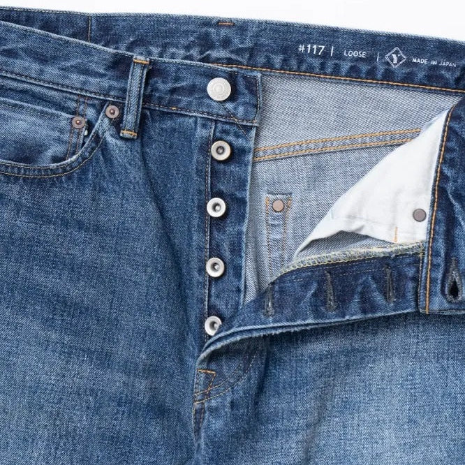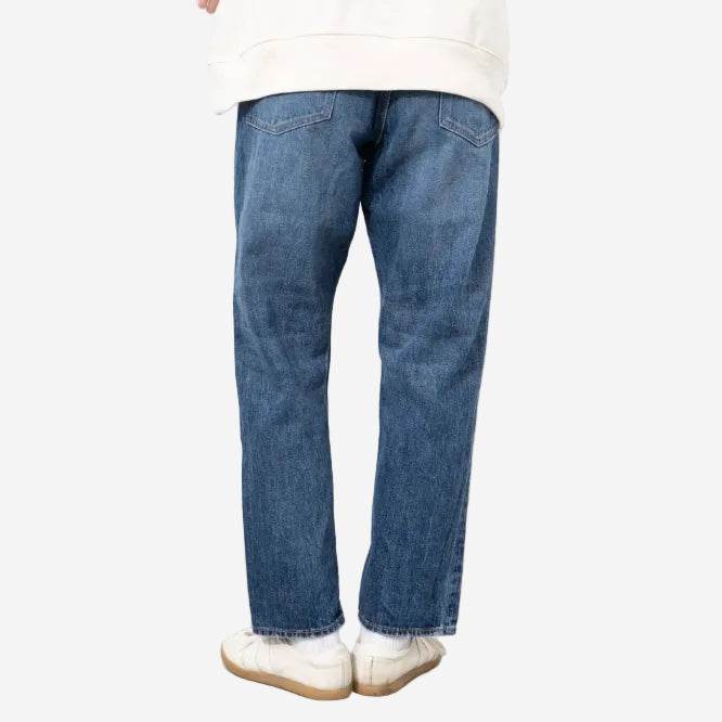 The silhouette of these jeans is loose with tapered legs, based off a pair of vintage LEVIS XX model. The size and stitching of each part are adjusted accordingly, with no changes to the waist or thigh width. However, the hips are slightly taken in for a more flattering fit. For added durability, a waist belt is sewn in one stroke, and the back pocket features a hidden bar fastening. The pocket opening is single-stitched and the coin pocket is adorned with selvedge "ears". The front opening is stitched in a V shape, replicating the vintage sewing techniques of the 1960s when backstitching was not available on sewing machines.