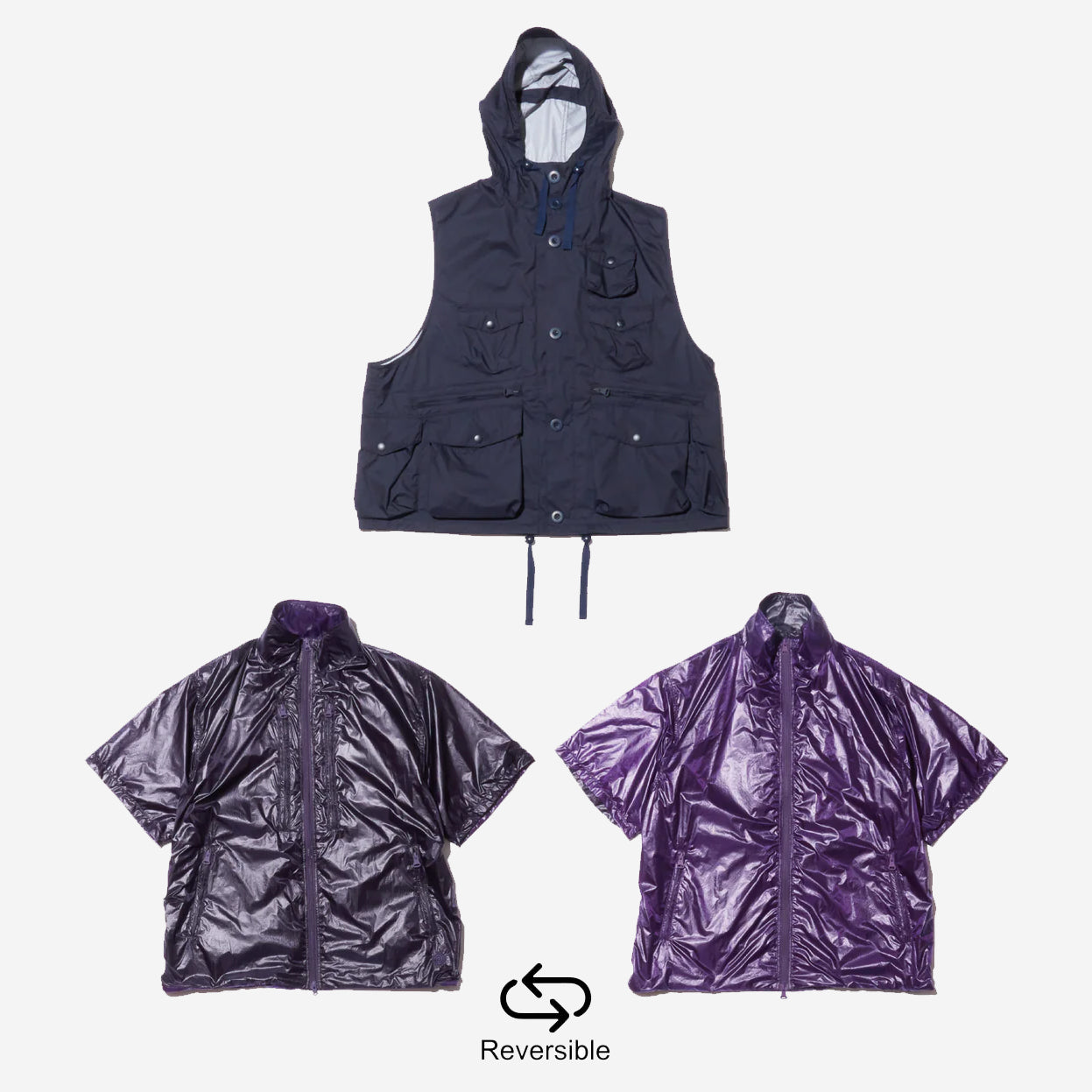 - Zippered chest pockets (on dark purple side)