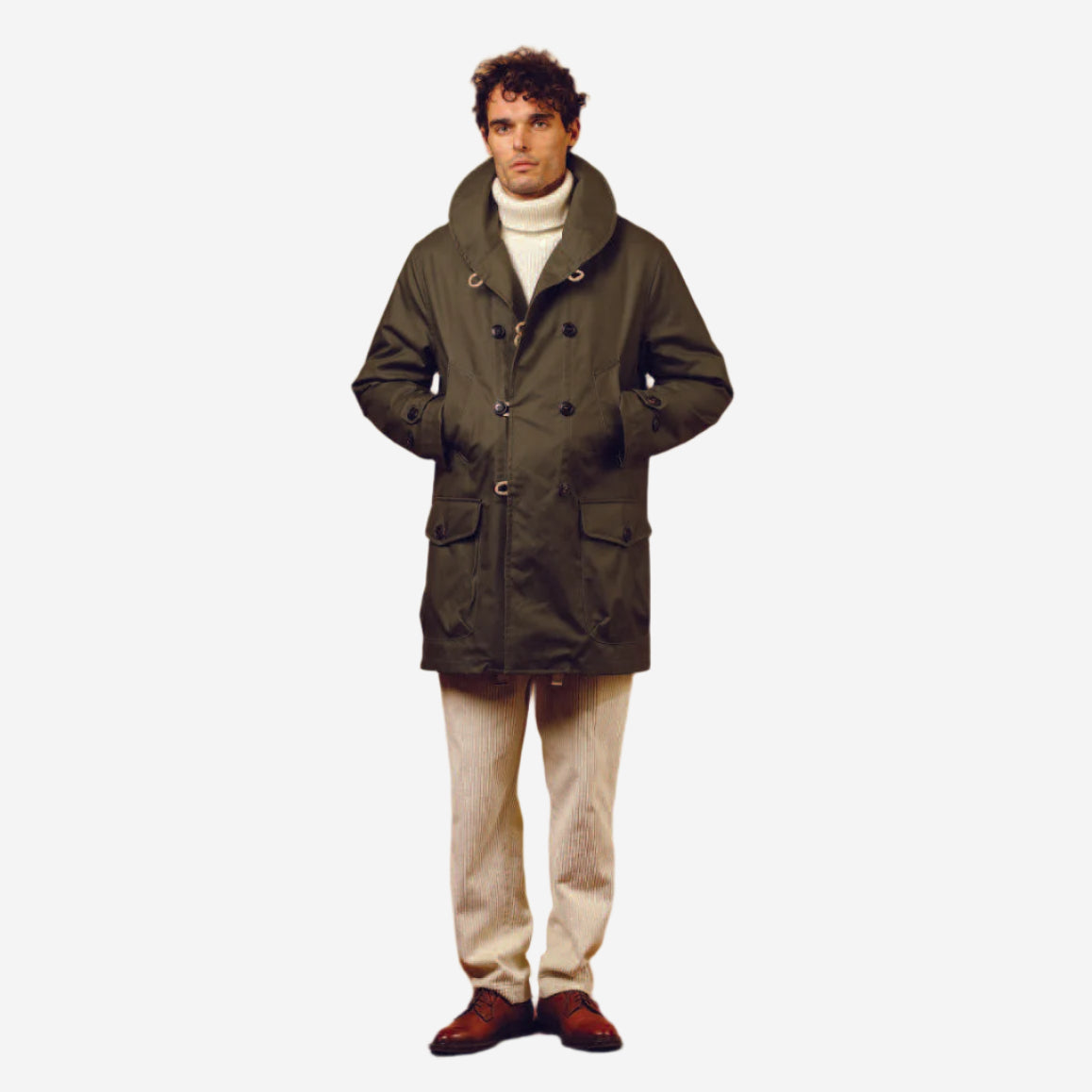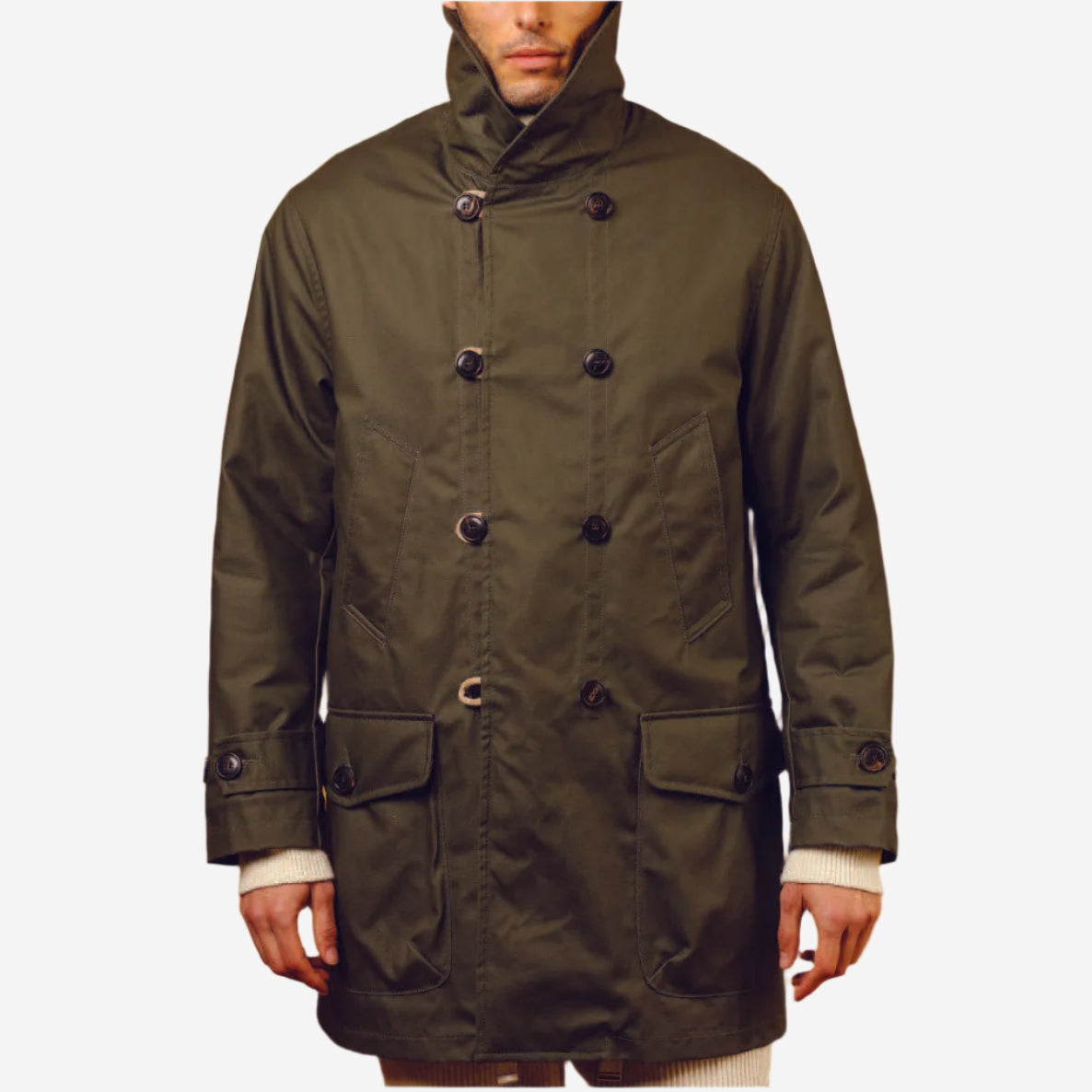 This Clayton double breasted coat from East Harbor Surplus exudes classic workwear sensibility and offers comfort, free range of motion and protection against the wind, water and moisture. Featuring a highly water resistant resin canvas shell, the shawl collar can be adjusted to add protection from the elements. Storage comes via with two chest hand pockets and two buttoned patch bellowed pockets while the rear vent improves comfort via ease of movement and enhances the jacket's drape and silhouette. The corozo nut buttons are larger than standard buttons, giving the piece a classic, stylish look while the quilted nylon interior provides ideal warmth without the bulk and allows for layering.