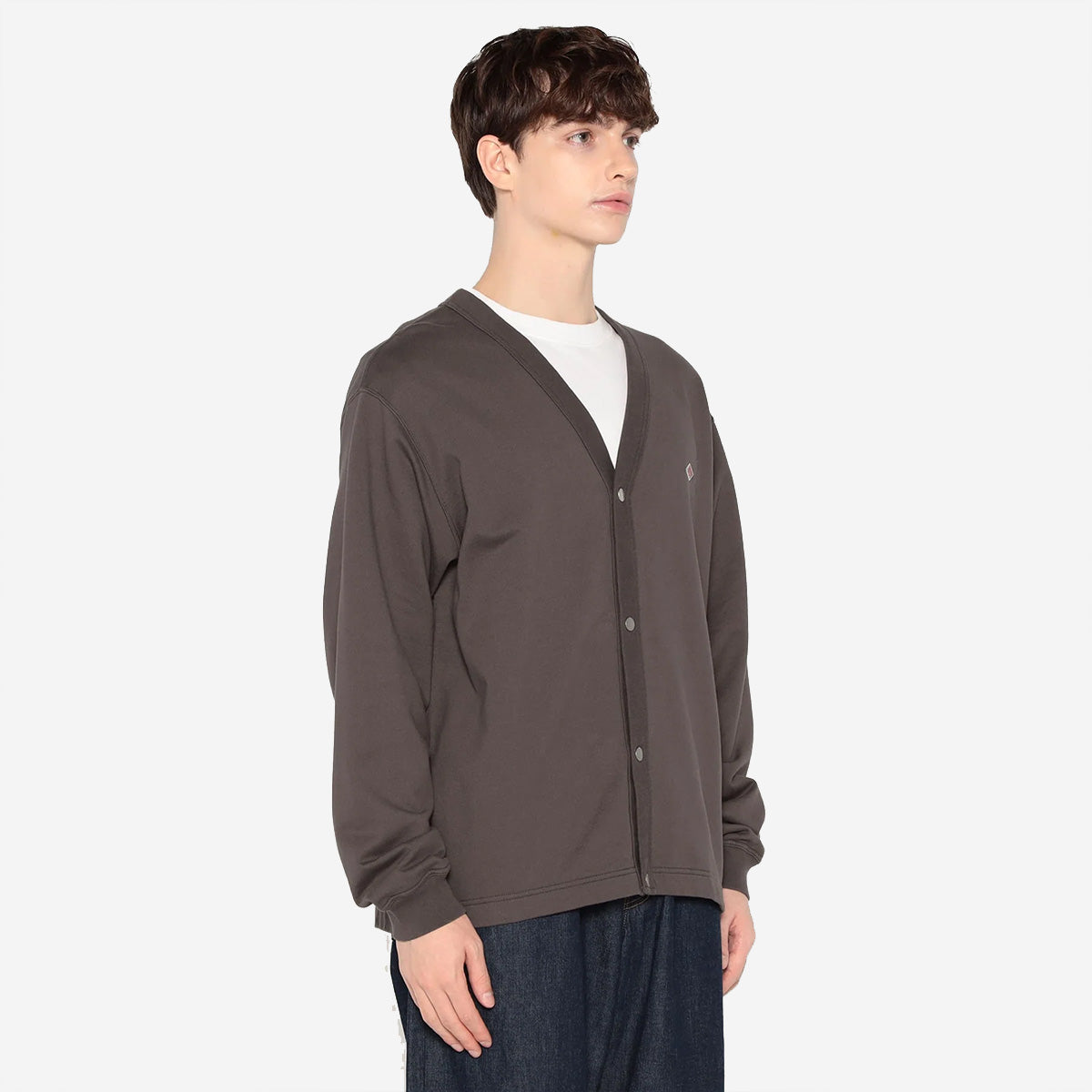 This V-neck cardigan with large dotted buttons is made of inlay fabric and has a slightly loose-fitting silhouette. The inlay fabric, with its lightweight feel - is made of 20/- yarn for the outer yarn, giving it an elegant yet natural appearance. Easy to match with a crewneck t-shirt or collared button-down shirt, the ribbed cuffs, neckline and loose silhouette create a great sense of drape and fabric.