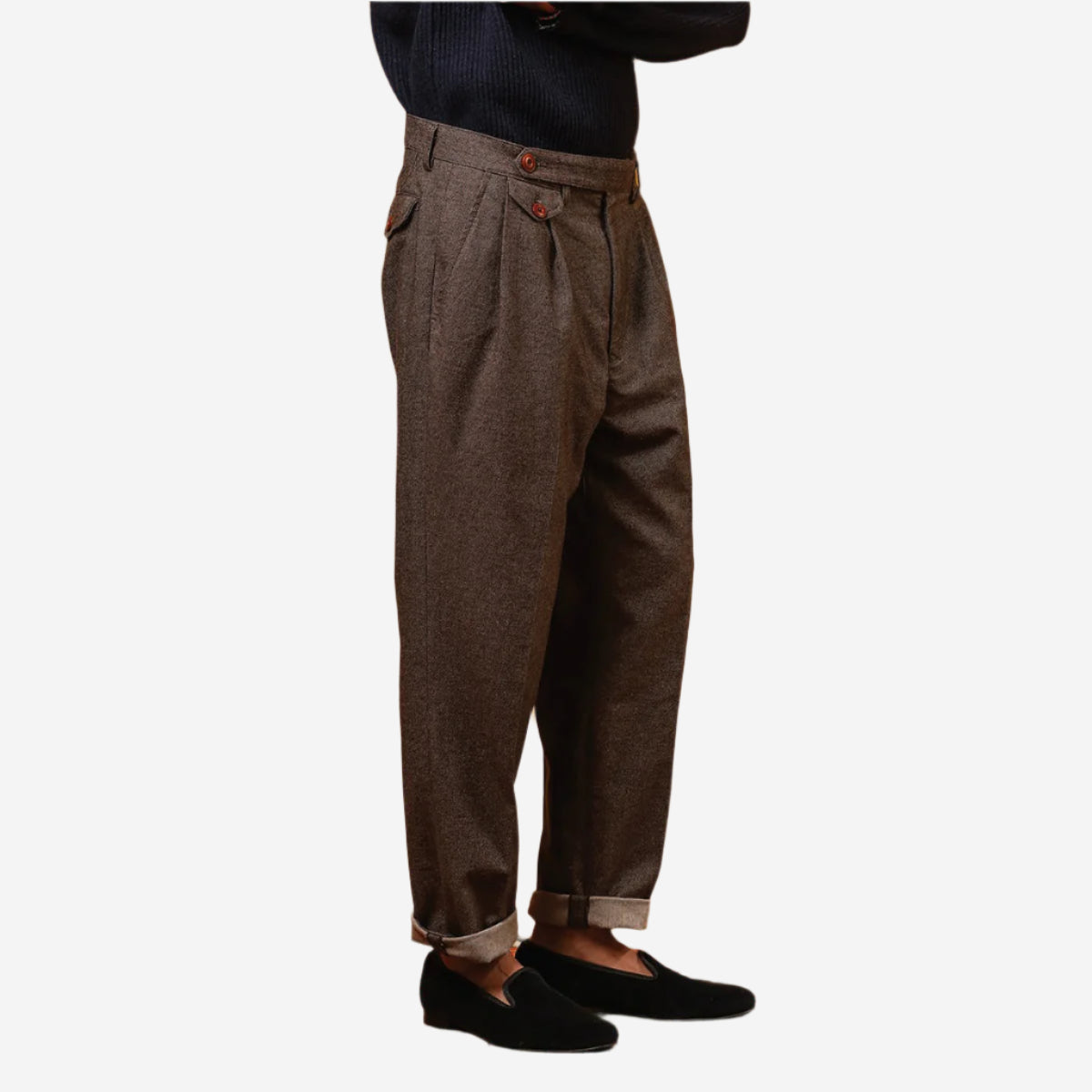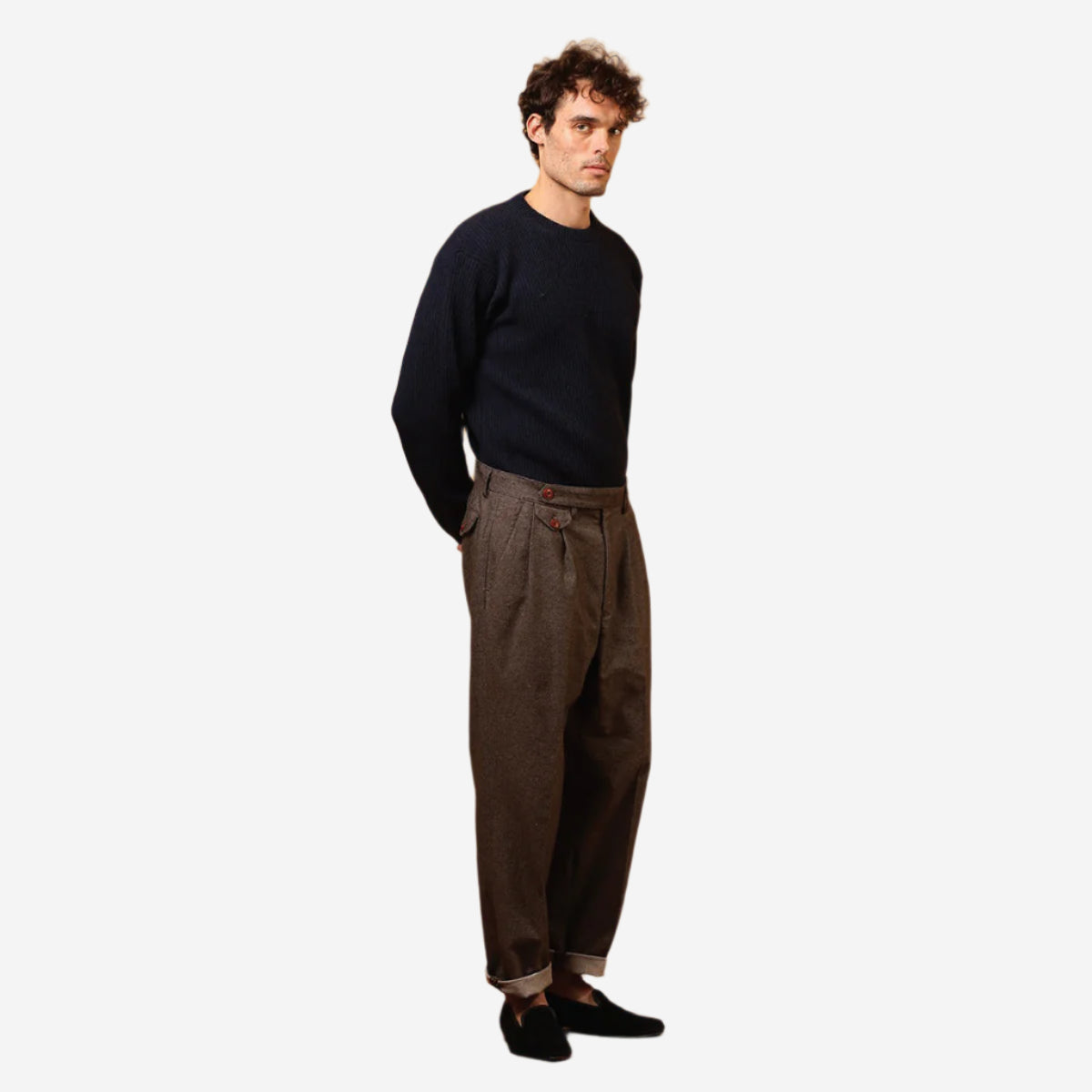 East Harbour Surplus continues to look to archival military pieces for inspiration this season and this pair is inspired by Gurka trousers worn by the British Indian Army in WWII. Delivered in a washed cotton and poly twill in brown, the fabric produces natural flecking giving it deep character. Secured with a French button closure and zip fly, the two pleat front is accentuated with a slightly tapered leg and finished with two side entry pockets, two flap pockets at the rear, a coin pocket with flap and corozo buttons.
