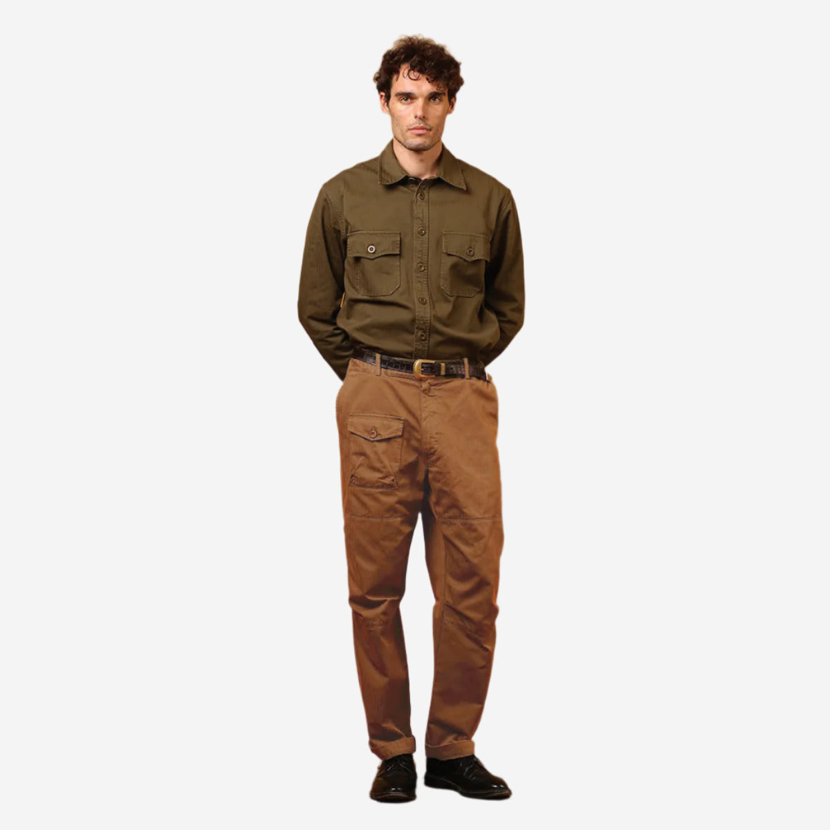 East Harbour Surplus continues to look to archival military pieces for inspiration this season and delivers this pair garment dyed cotton pants in a rich khaki. Inspired by the trousers supplied to the British Air Force helicopter pilots in World War II, this particular pair features an elasticated waist with a patch pocket on the right thigh. Two side entry pockets, single flap pocket and welt pocket at the rear and a relaxed, straight silhouette finish off the look.