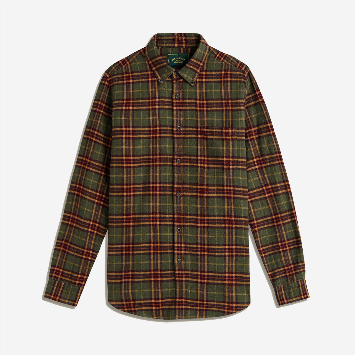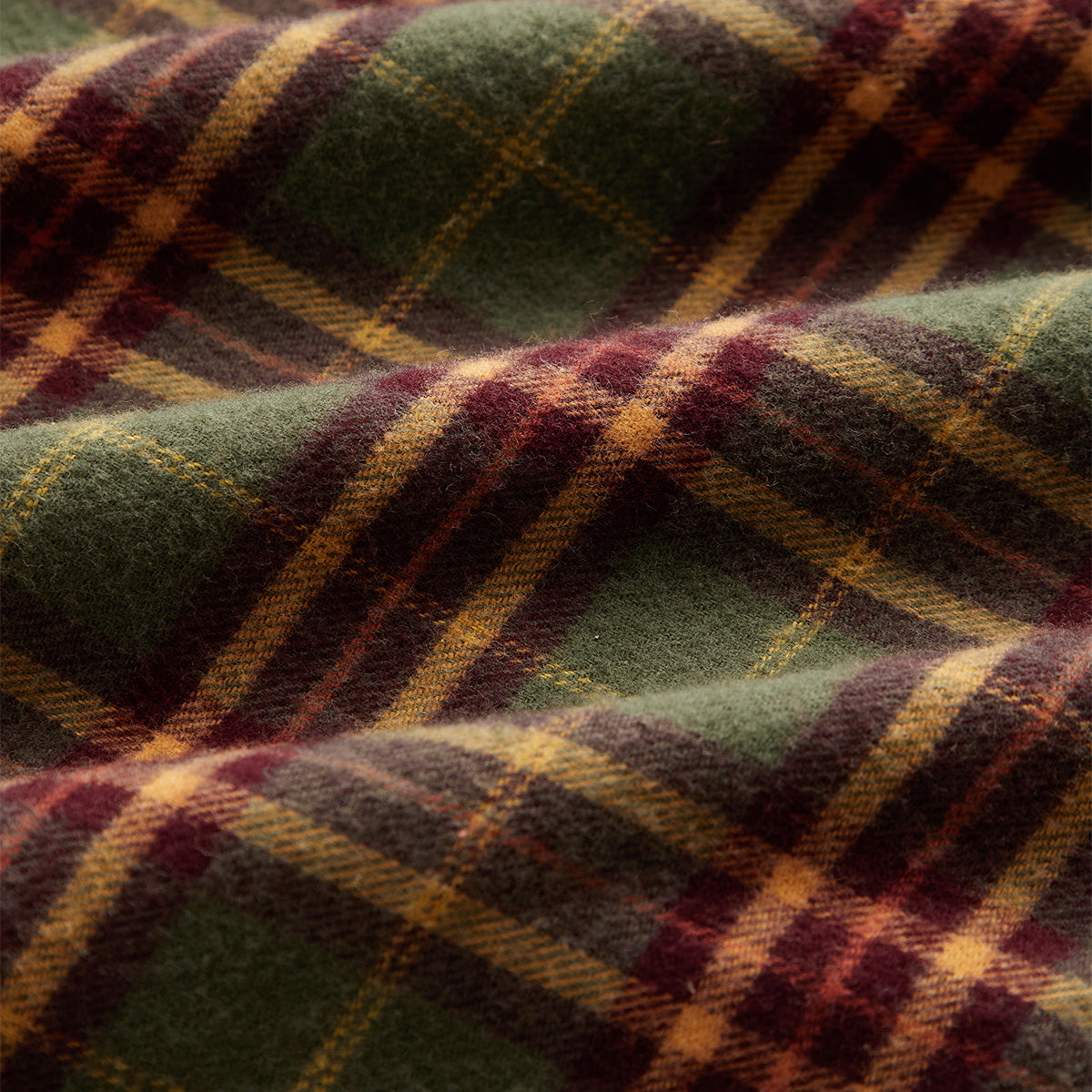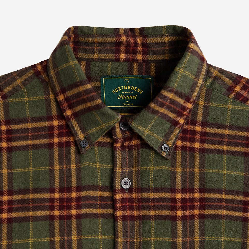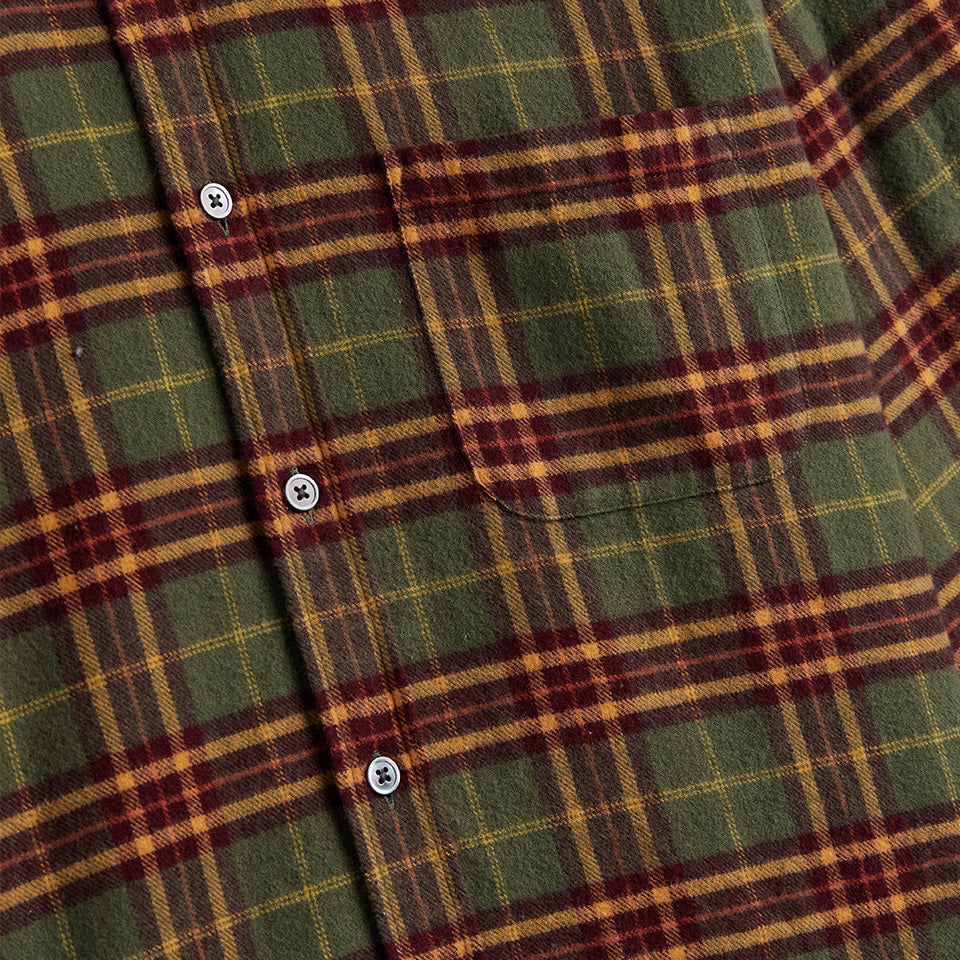 The Hoop shirt features an olive green and burgundy plaid pattern with amber accents and chest pocket with a classic point collar. The shirt is slightly fitted and features a long sleeved construction, and the brands renowned and extremely soft flannel.