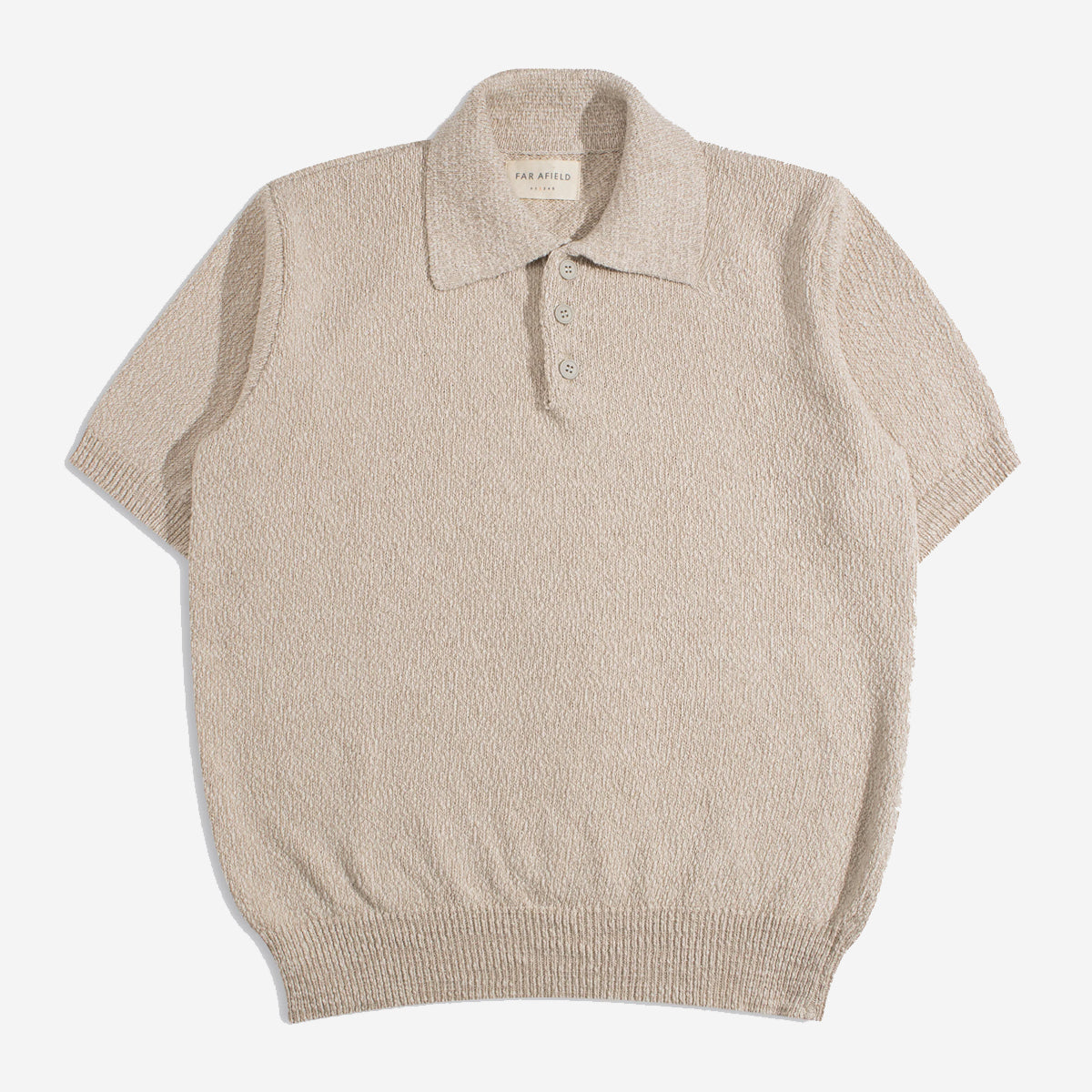 A short-sleeve knitted polo with a relaxed fit, three-button placket and a neat, flat-knit collar. Knitted from an Italian mélange yarn that combines cotton with Ecovero viscose and linen, giving a soft, tactile handle with added weight, breathability and durability.