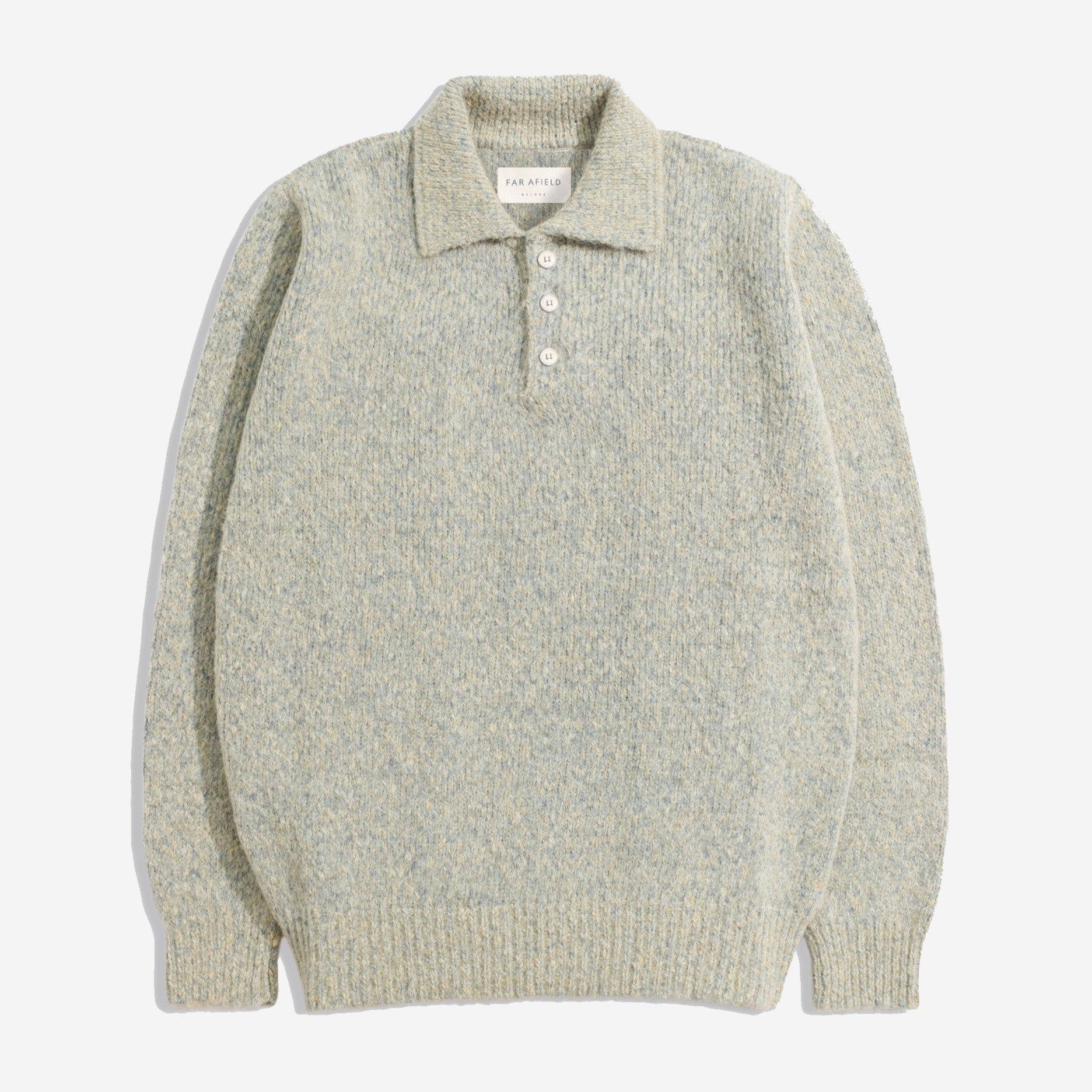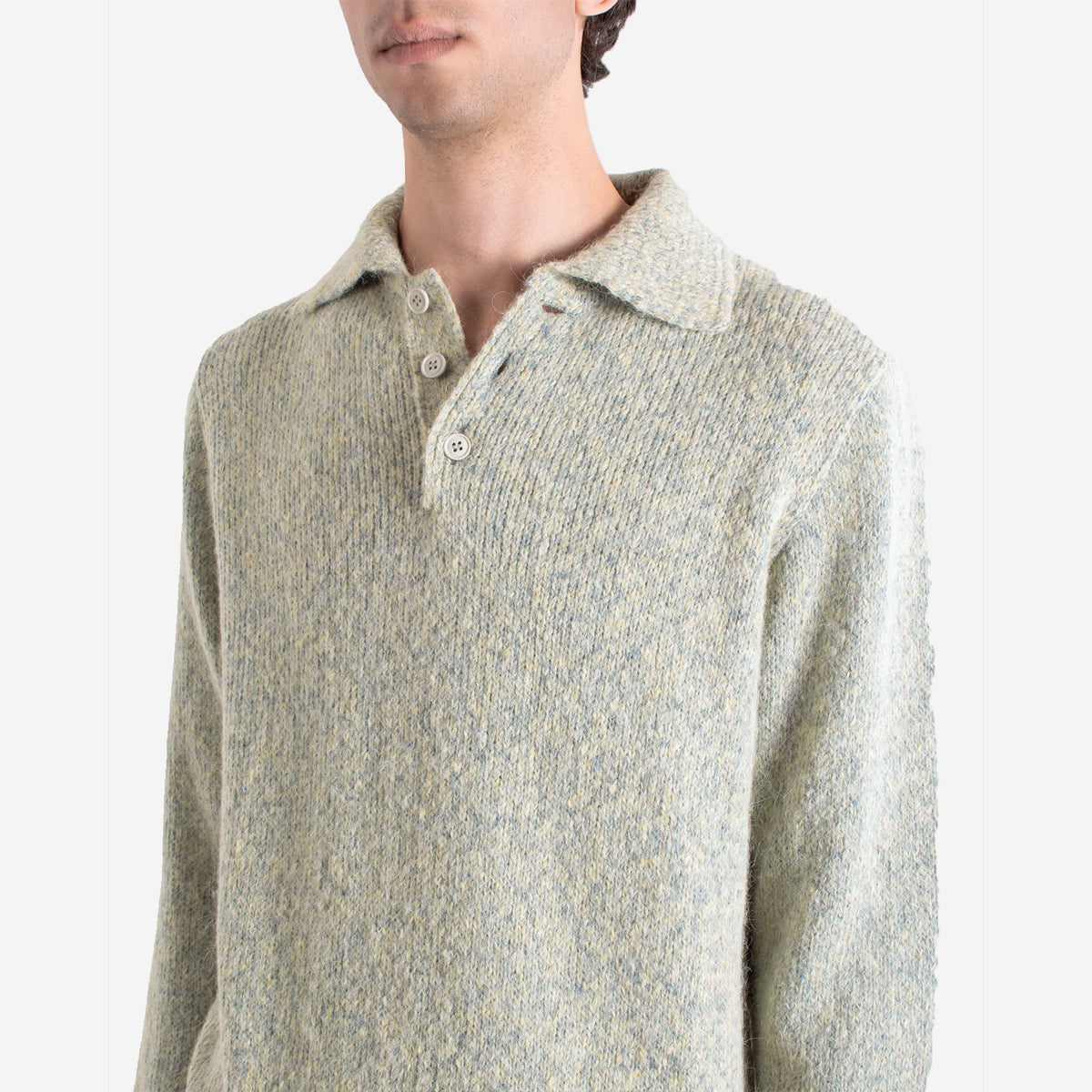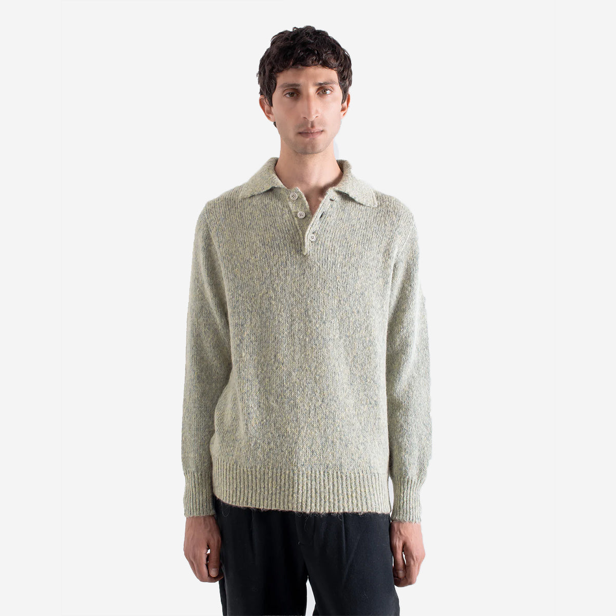 This heavier-weight long-sleeve polo is elegant with a twist, courtesy of the multi-coloured knit. Made from a recycled and organic cotton and wool blend in Turkey, the stone base features flecks of blue for a subtle pop. The polo features a classic collar, button placket, and elasticated cuffs and hem.