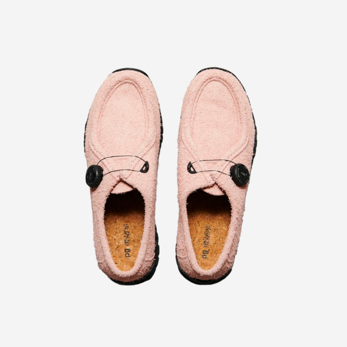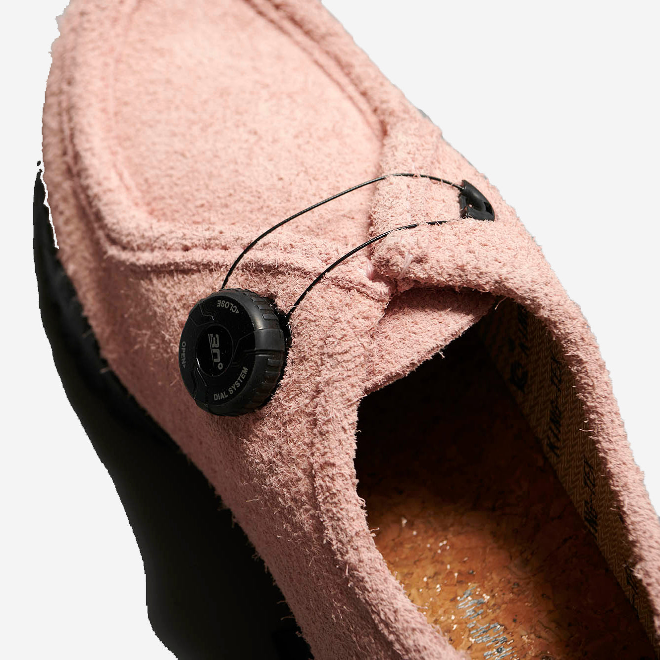 The popular KNOCK 2 model in pink shaggy suede is equipped with KING-TEX, a waterproof and breathable membrane which allows moisture in the shoe to escape to the outside, improving breathability. The shoe's upper is made from shaggy suede, a type of suede with a longer, more textured nap. The FREELOCK system allows a secure fit and the Vibram MEGAGRIP sole, usually the reserve of trail running shoes, has been added to a pair of moccasin style shoes that are uniquely PLAYGROUND.