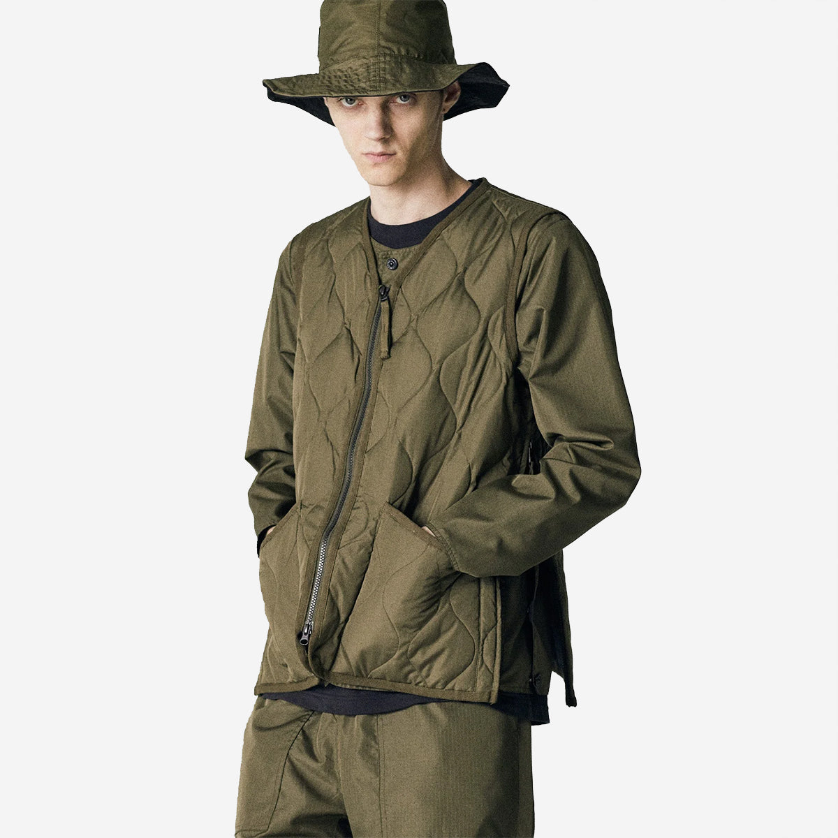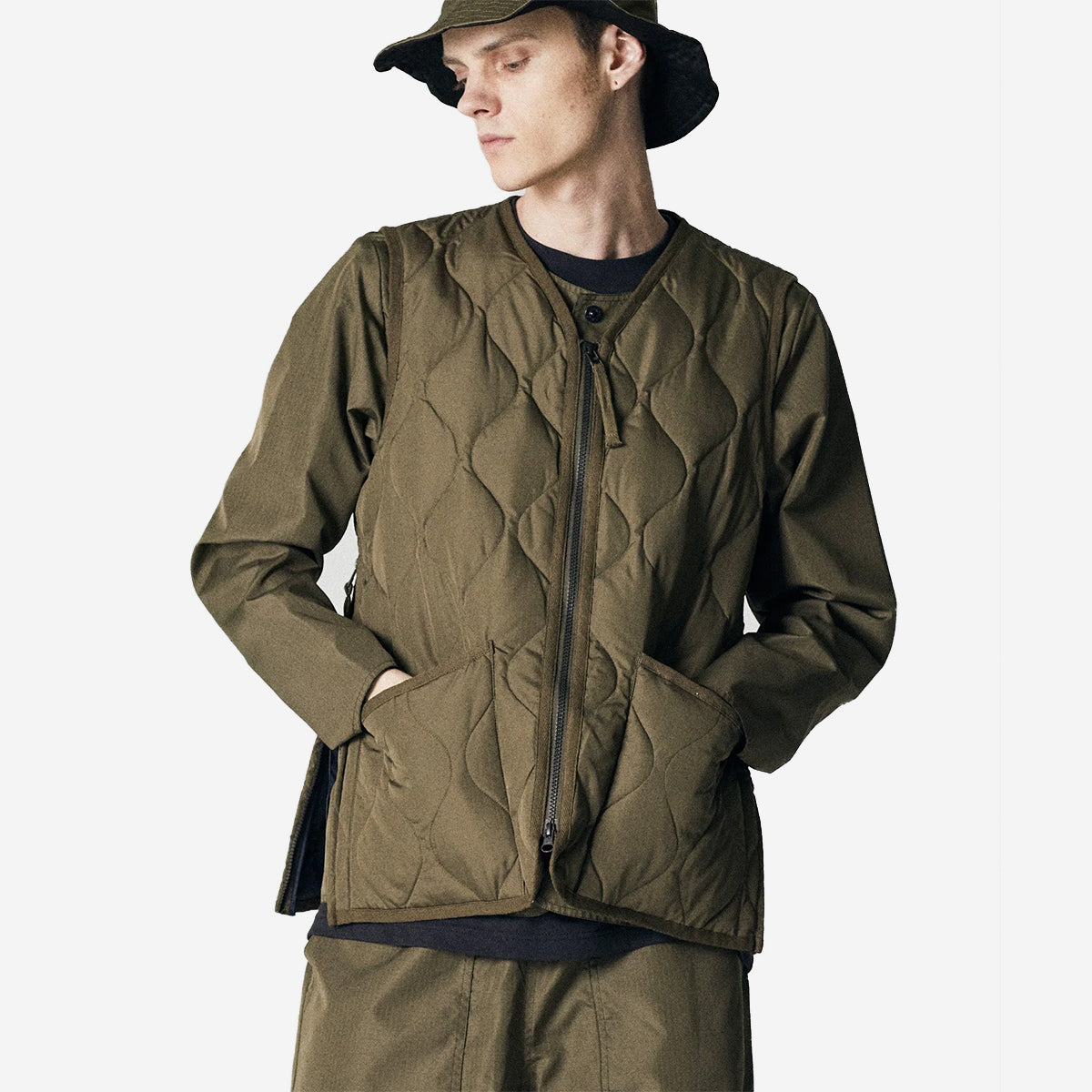 This down vest, part of TAION's Military line, incorporates loofah (or dumbbell) quilt stitching on the tough ripstop poly fabric with a slight checkered pattern. The 800FP down and feather fill provides optimal heat retention. The zipper on the side not only plays a role for ventilation, but also follows the ease of putting on and taking off. The double zip allows for easy layering while the two front patch pockets provide excellent storage capacity. All while being compact enough to pack and carry it with you. Its easy-to-wear design can be worn under jackets and coats, as well as on T-shirts, shirts and hoodies. Packable into included travel bag. Compact storage makes it easy to carry. Perfect for going out or traveling.