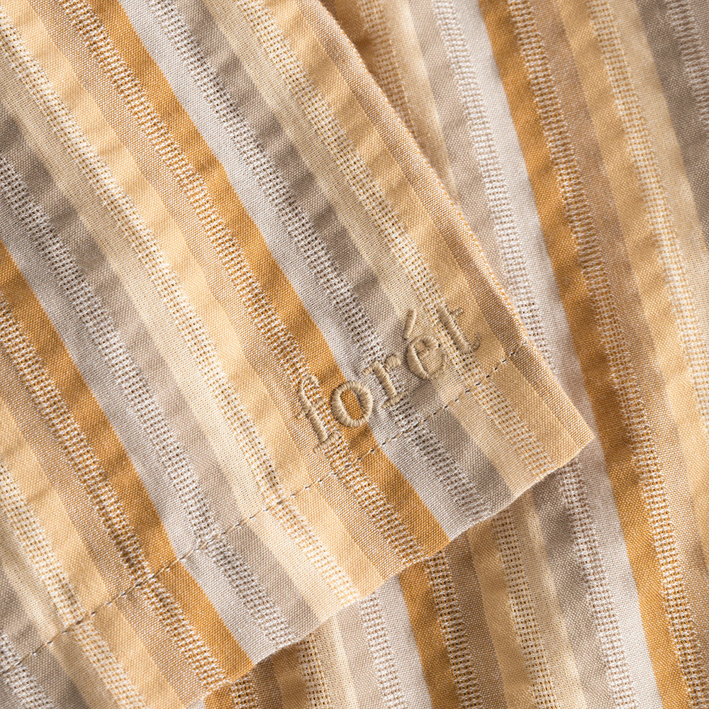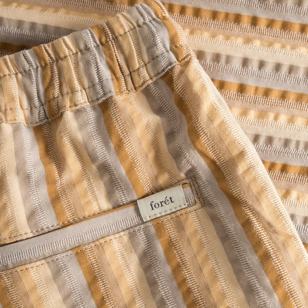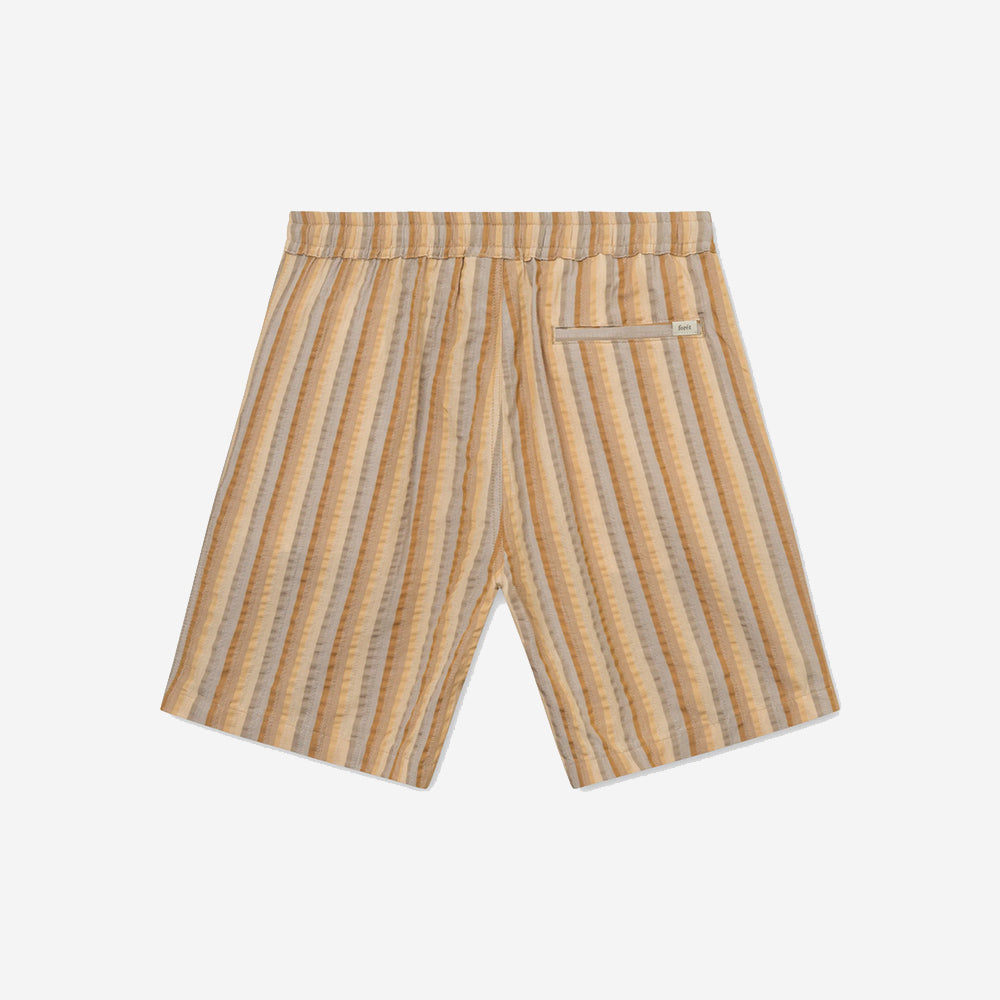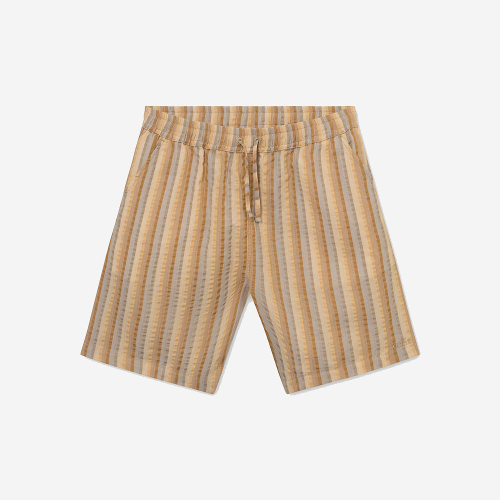 These shorts are made from breathable seersucker fabric, ensuring a perfect blend of style and functionality. Featuring a delightful three-color stripe in warm tones, they add a touch of vibrancy to your outfit. Pair it with the OTTER shirt.