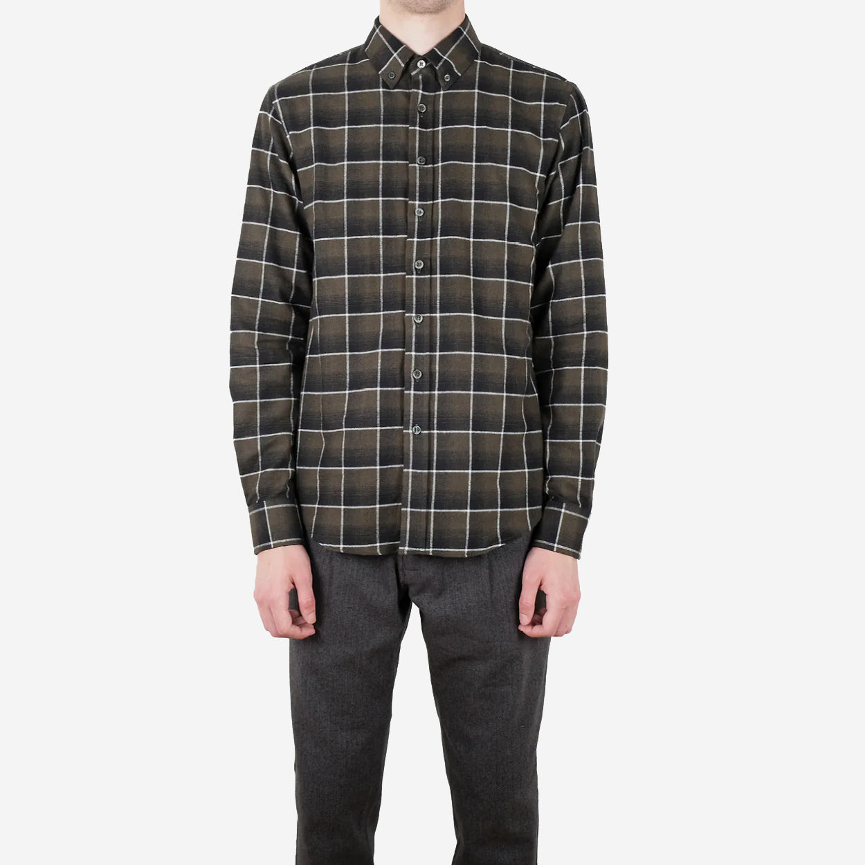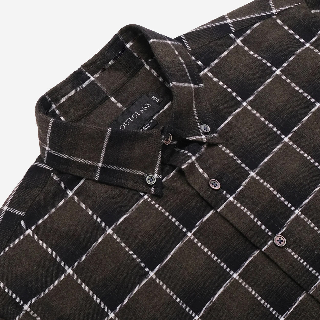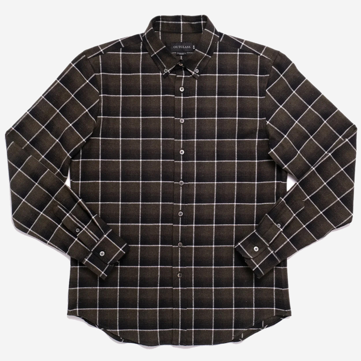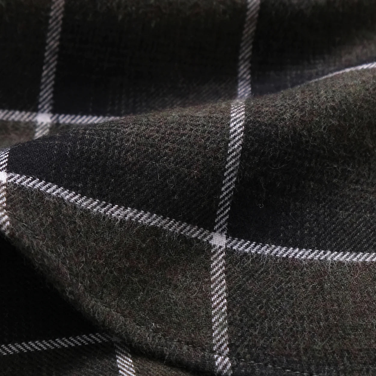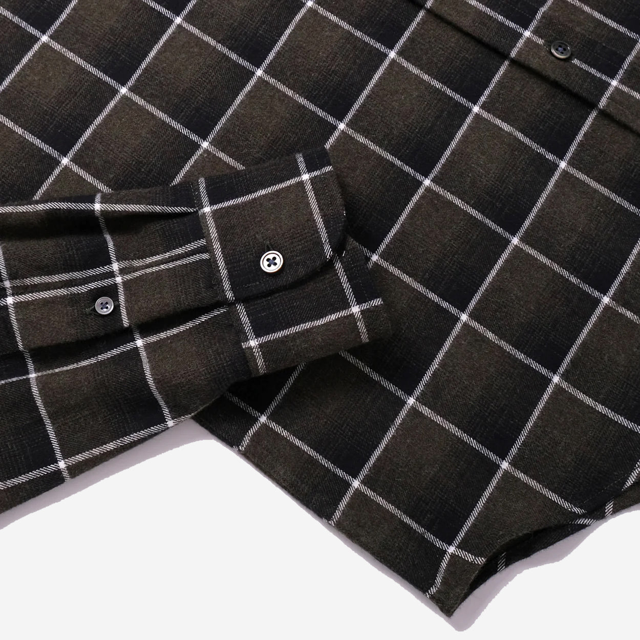 This Olive Shadow Plaid Flannel Shirt is crafted from a Spanish flannel fabric that offers warmth and softness. It features a brushed twill in a shadow plaid pattern and double-needle stitching for enhanced longevity. The grey mother of pearl buttons complete its sophisticated design. Enjoy long-lasting quality and classic style with this shirt.