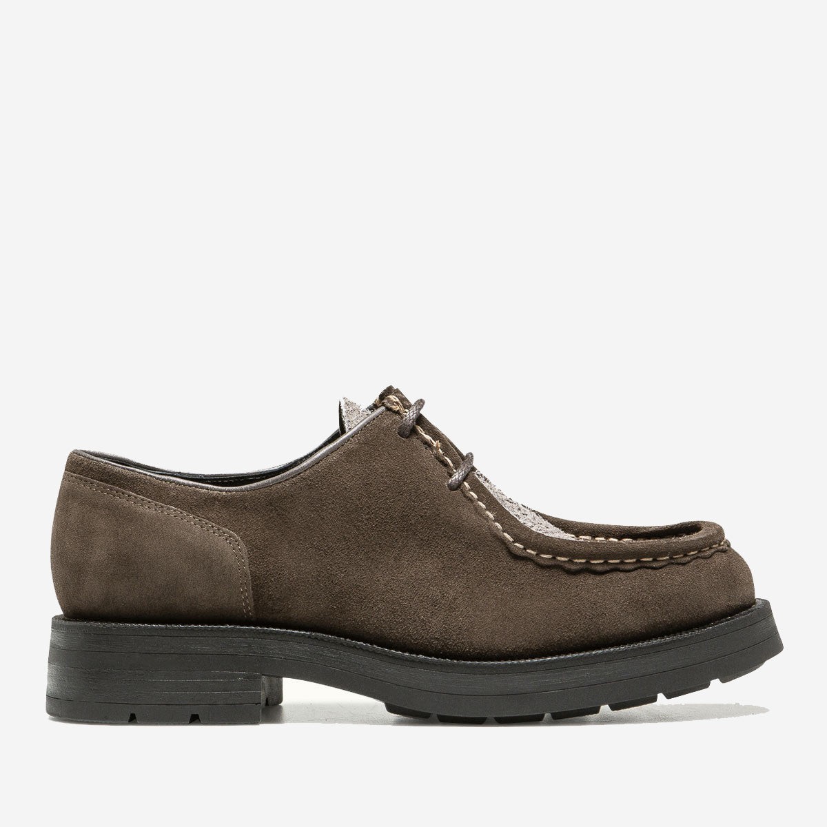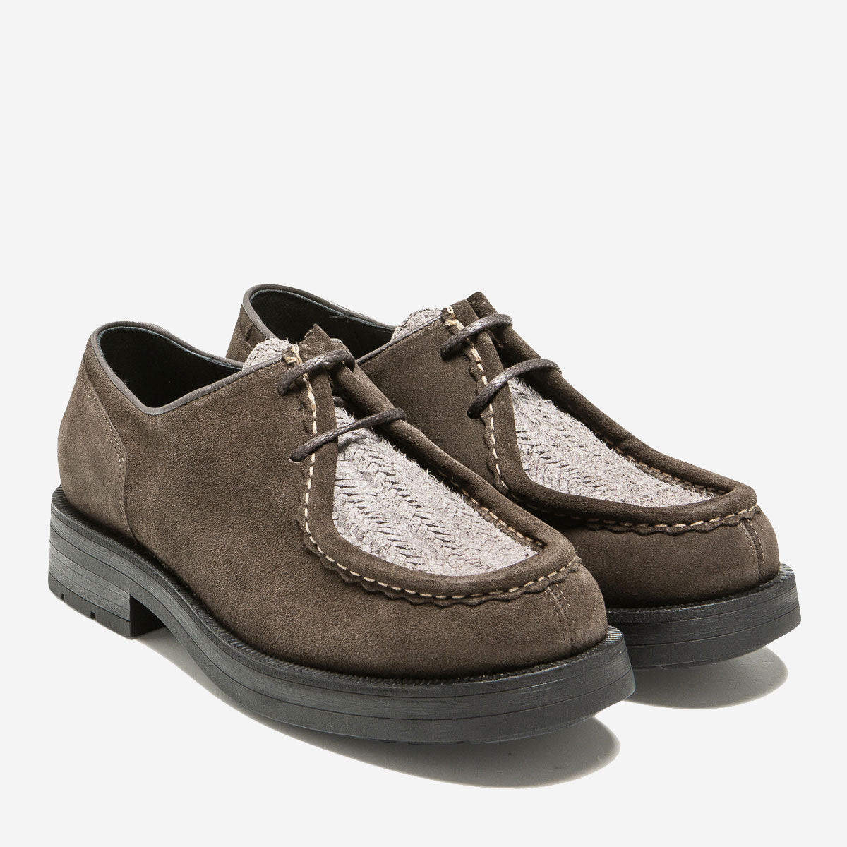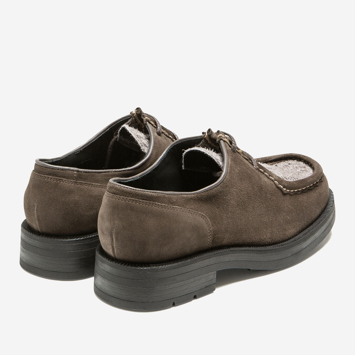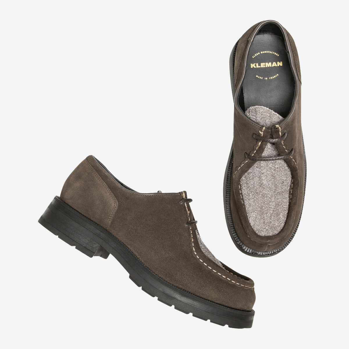 The TAMBOUR model is a pair of thick sole derby shoes with a two-tone suede finish. Similar to it's PADROR cousin but with a thicker rubber outsole, this "maroon" suede tyrolean shoe features a grey-ish hairy suede herringbone vamp. Made from quality European leathers, the upper is welded on a rubber anti-slip TRAVERSE GRIP sole. The sole embodies a retro- classic look with inflated volumes and the offset of the treads towards the inside. Finished with calf lining.