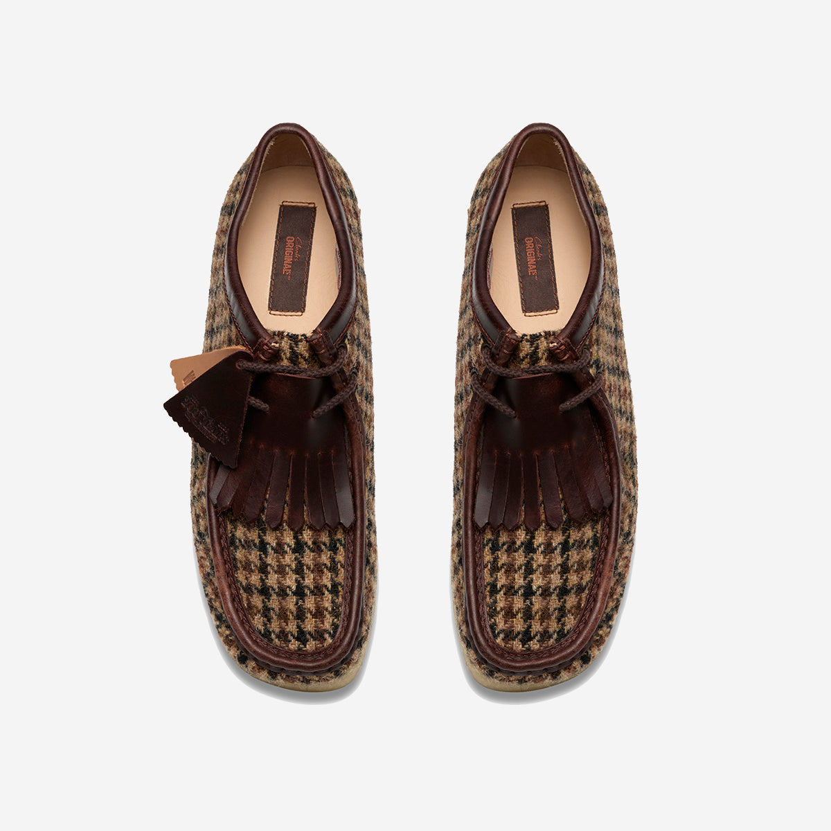 Introducing the Clarks Wallabee™ Harris Tweed Pack, a refined take on their iconic Wallabee™ silhouette, blending British heritage with timeless craftsmanship. The standout feature of this limited-edition Wallabee™ is the striking rich brown Harris Tweed upper, detailed with a leather collar and apron binding, giving it a polished finish. Inside, you'll find the Harris Tweed woven label stitched into the quarter, while an elegant Harris Tweed hang tag adds a touch of authenticity. The two exclusive Clarks Originals FOBs—a premium leather FOB and a commemorative 200-year anniversary FOB—add a touch of distinction. For personalisation, the shoe comes with a detachable kiltie, while the brown round waxed laces with tassel aglets and matte finish brown eyelets elevate the refined aesthetic. The natural pebble crepe* sole ensures comfort and traction, true to Clarks Originals tradition. Inside, the signature Clarks Originals woven sock label guarantees authenticity. A perfect blend of heritage craftsmanship and contemporary design, this Wallabee™ is a standout addition to any collection. A perfect blend of heritage craftsmanship and contemporary design, this Wallabee™ is a standout addition to any collection.